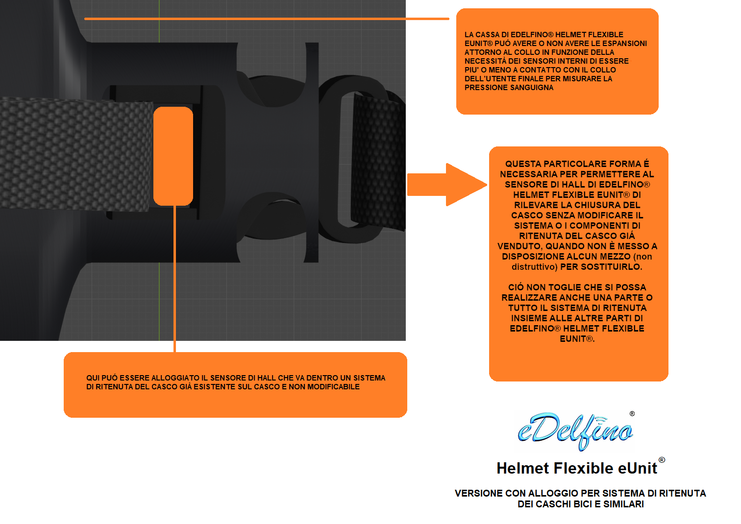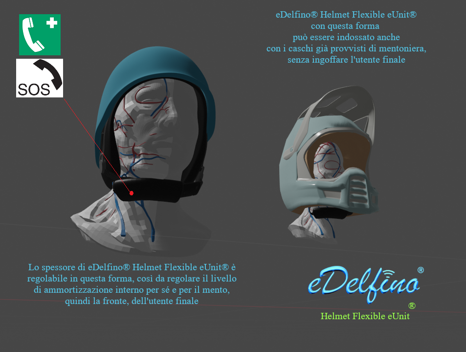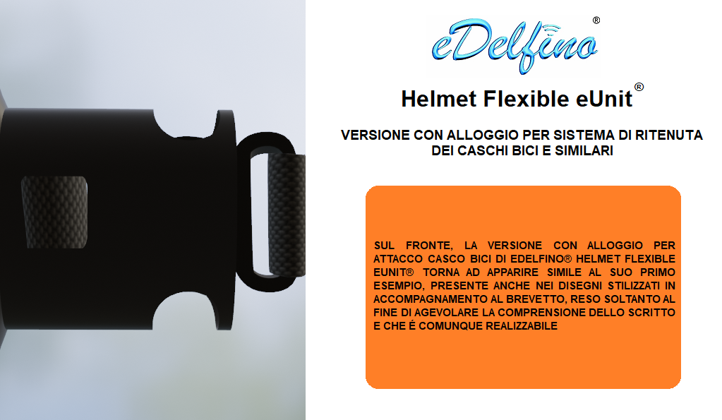- eDelfino® Helmet Flexible eUnit® è un prodotto brevettato, quindi unico nel suo genere, dedicato alla chiamata d’emergenza, anche e non soltanto di tipo eCall, ed è progettato per essere applicabile su tutti i caschi, compresi i caschi da moto, da bici e similari.
